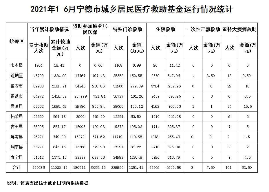 2021年1-6月宁德市城乡居民医疗救助基金运行情况统计