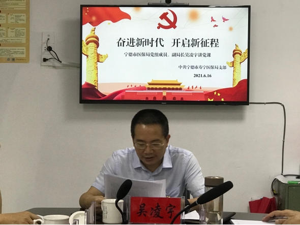6月16日,宁德市医疗保障局党组成员、副局长吴凌宇赴寿宁,以《奋进新时代 开启新征程》为题,为寿宁医保局党支部全体党员上了一堂党史学习教育专题党课。党课以重温党的历史,激发爱国热情;着眼未来发展,建设美好愿景;坚定理想信念,增强党员意识;勇于担当作为,尽责本职工作为主线,重温中国共产党走过波澜壮阔的历程,对于寿宁医保党员干部树立坚定的共产主义信仰,提高干事创业能力具有十分重要的意义。吴凌宇要求,医保系统基层党组织要把开展“我为群众办实事”实践活动贯穿党史学习教育全过程,巩固深化“不忘初心、牢记使命”主题教育成果,大力弘扬“四下基层”“马上就办”等优良作风,组织开展“党旗在基层一线高高飘扬”“立足岗位作贡献”“三比三赛”等活动,组织实施岗位先锋、服务先锋等行动,积极服务基层、服务项目、服务群众,发挥各自优势,办好实事好事。