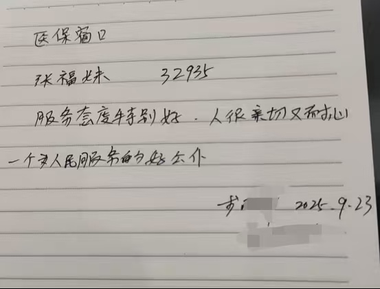 9月23日,李女士来到福安医保窗口,她的丈夫身患重病,希望打印丈夫的基本医疗保险结算单。由于不熟悉业务名称,李女士一时难以清晰表达具体需求。面对李女士因焦虑而语无伦次的情况,工作人员始终保持耐心与微笑,主动通过电话与李女士的丈夫直接确认,了解到打印结算单是为了前往总工会和民政部门申请医疗救助,工作人员在完成系统打印后,进一步主动询问“是否需要多份复印件”,并将20余页单据按住院、门诊分类装订,逐份加盖“医保综合业务章”配以便签。李女士深受感动,当场手写留言,赞扬工作人员亲切、耐心、细致地服务。
