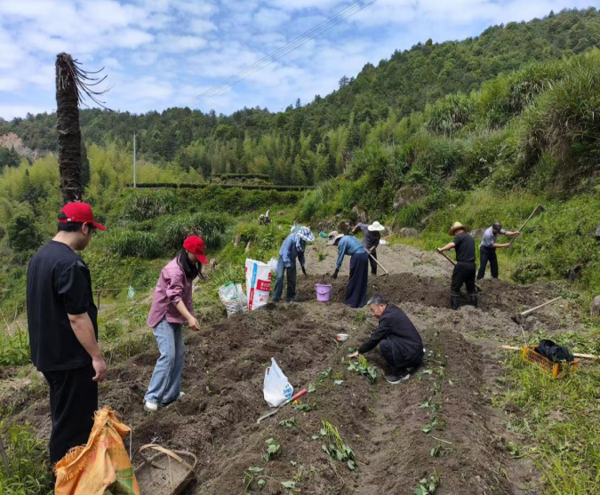 土豆收获结束后,大家立即投入地瓜苗种植。党员紧跟农户指导,翻土、施肥、栽种、浇水。“锄头要斜着入土,化肥得撒在苗根外侧……”在农户手把手教学下,大家迅速掌握技巧,分工协作间,一排排地瓜苗在田间挺立。