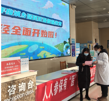 展播即全面利用医院就诊大厅led大屏、药店临街显示屏等滚动播放全民参保宣传片;设点即在辖区各定点医院导览台、药店柜台放置城乡居民参保缴费流程、报销待遇等各类政策宣传单,并粘贴参保缴费温馨提醒及参保缴费二维码等,便于群众随时取阅、了解相关政策以及扫码缴费;划区即由医保和医院工作人员组成志愿小队,走进等候取药区等地现场进行医保相关政策讲解,积极协助群众缴纳医保费;派单即以“两定”医药机构为宣传阵地,向就诊购药的患者分发医保参保宣传单。
